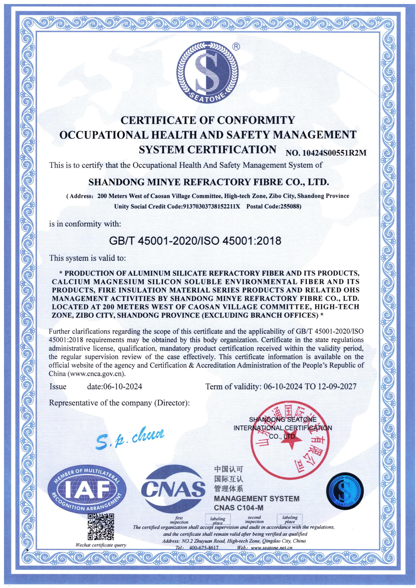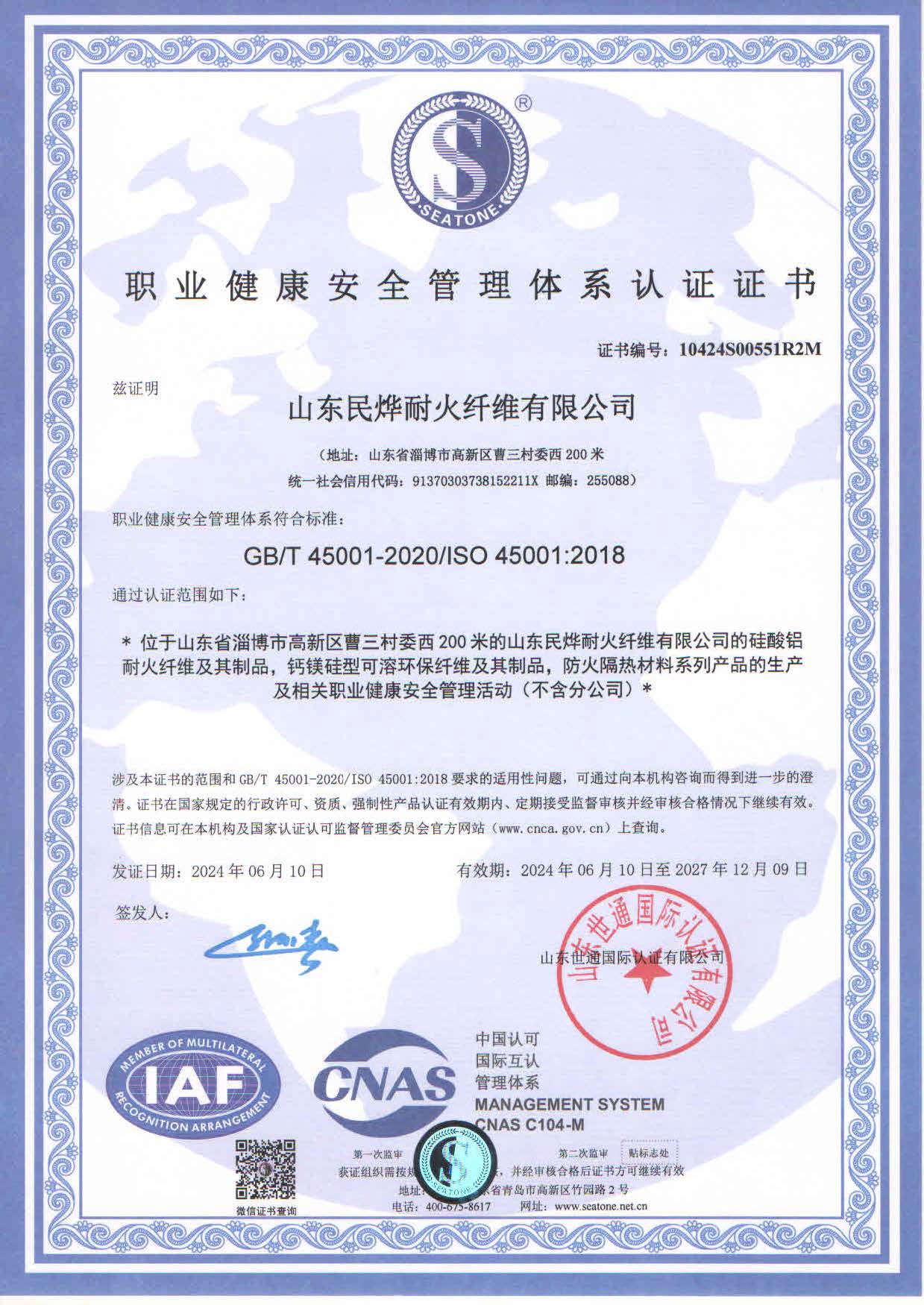 職業健康安全管理體系認證證書